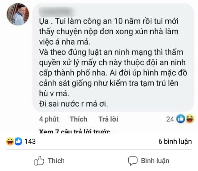 Ngoài ra, rất nhiều ý kiến cũng “soi” được điểm vô lý trong bức ảnh là quân phục của chiến sĩ công an trong ảnh không có quân hàm. Đặc biệt, trong một bình luận của một tài khoản tự xưng là làm trong ngành 10 năm cho biết, lần đầu tiên thấy trường hợp nộp đơn kiện rồi công an xuống nhà làm việc. Hơn nữa, theo luật an ninh mạng, vụ việc của Hương Giang thuộc thậm quyền xử lý của đội an ninh cấp thành phố, chứ không có chuyện công an đến nhà như đang “kiểm tra tạm trú” thế này.