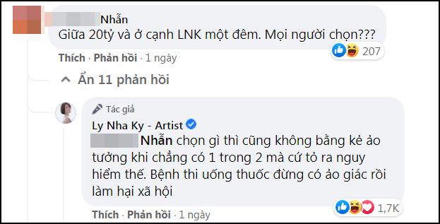 Gần đây nhất, khi đăng tải một bức hình quyến rũ của bản thân trên trang cá nhân, một tài khoản MXH đã bình luận nhạy cảm dưới bài đăng: “Giữa 20 tỷ và ở cạnh Lý Nhã Kỳ một đêm. Mọi người chọn??". Câu hỏi lập tức gây chú ý từ CĐM với nhiều lượt like và phản hồi.