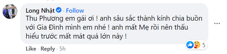 Dưới phần bình luận, nhiều sao Việt đã gửi lời chia buồn đến nữ ca sĩ. Có thể kể đến loạt nghệ sĩ như Dương Triệu Vũ, Tự Long, BTV Quang Minh, ca sĩ Long Nhật vô cùng xót xa xa động viên đồng nghiệp.