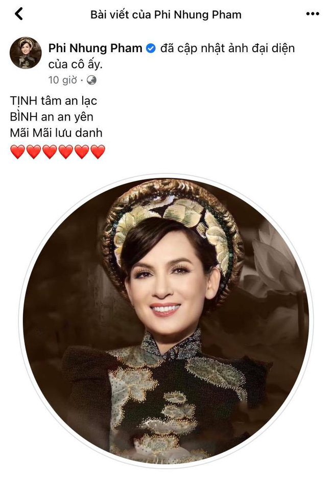 Mới đây, fanpage chính thức của Phi Nhung đã thay đổi ảnh đại diện thành bức hình rạng rỡ, xinh đẹp khi còn sống của cố ca sĩ cùng lời chia sẻ: "Tịnh tâm an lạc, bình an an yên. Mãi mãi lưu danh".