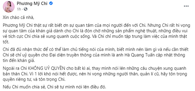 Nữ ca sĩ khẳng định không nhờ hay ủy quyền bất cứ ai để nói những câu chuyện xung quanh của cô nàng. Phương Mỹ Chi nói rằng bản thân đủ nhận thức, khi cần thông tin với khán giả sẽ ủy quyền với Đại diện truyền thông của mình. Phương Mỹ Chi mong muốn khán giả quan tâm mình qua những sản phẩm âm nhạc thay vì các câu chuyện bên lề của đời tư hay tin đồn bên ngoài.
