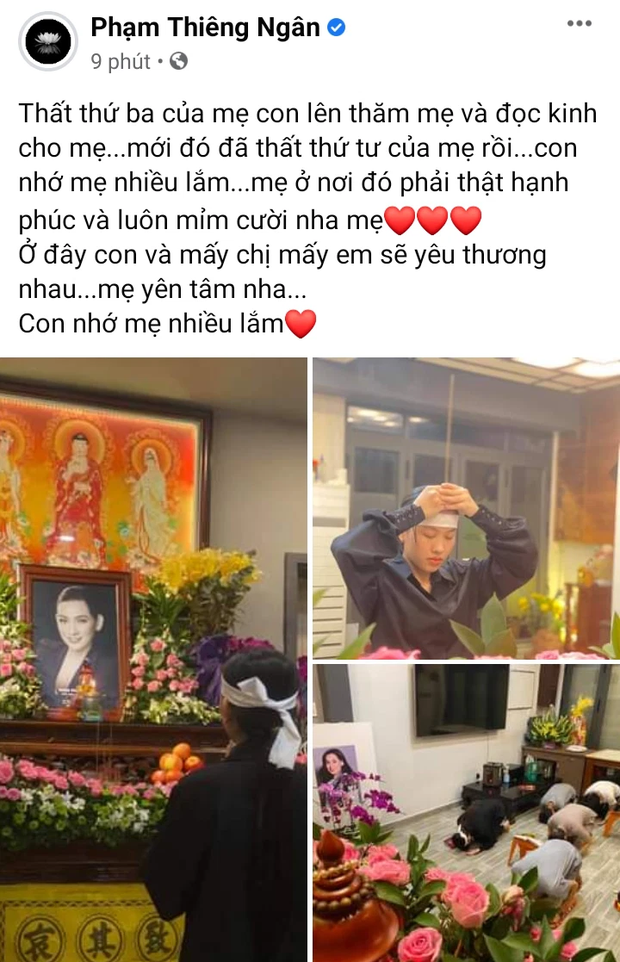 Trong khi đó, Thiêng Ngân tâm sự thời gian trôi nhanh quá, mới đó đã đến thất thứ tư của cố ca sĩ. Thiêng Ngân không quên nhắn nhủ: "Con nhớ mẹ nhiều lắm, mẹ ở nơi đó phải thật hạnh phúc và luôn mỉm cười nha mẹ. Ở đây con và mấy chị mấy em sẽ yêu thương nhau, mẹ yên tâm nha. Con nhớ mẹ nhiều lắm". Dưới bài đăng, nhiều khán giả để lại bình luận an ủi, động viên các con Phi Nhung mau chóng vượt qua sự mất mát này.