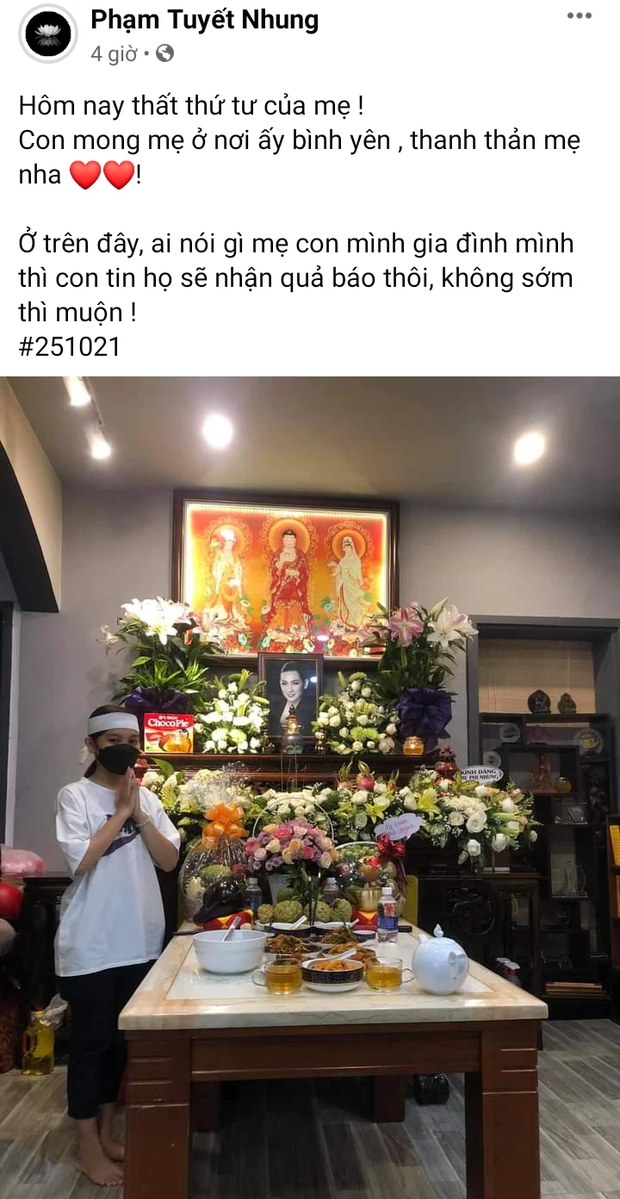 Hôm nay (25/10), đúng thất thứ 4 kể từ ngày Phi Nhung vĩnh viễn ra đi sau hơn 1 tháng chiến đấu với Covid-19. Qua đó, Tuyết Nhung và Thiêng Ngân – 2 trong số 23 người con nuôi của cố ca sĩ đăng tải hình ảnh đeo chiếc khan tang trắng, chắp tay cầu nguyện cho mẹ bên mâm cúng thất khiến khán giả không khỏi xúc động.