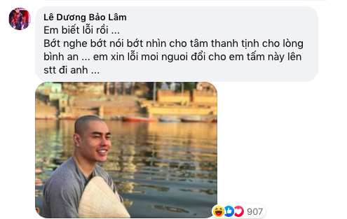 Ngay lúc này đây, "ông bố 2 con" không còn chí anh hùng nữa mà lập tức xuống nước. Quán quân Cười xuyên Việt nhắn nhủ: "Em biết lỗi rồi. Bớt nghe bớt nói bớt nhìn cho tâm thanh tịnh cho lòng bình an. Em xin lỗi mọi người đổi cho em tấm này lên dòng trạng thái đi ạ".