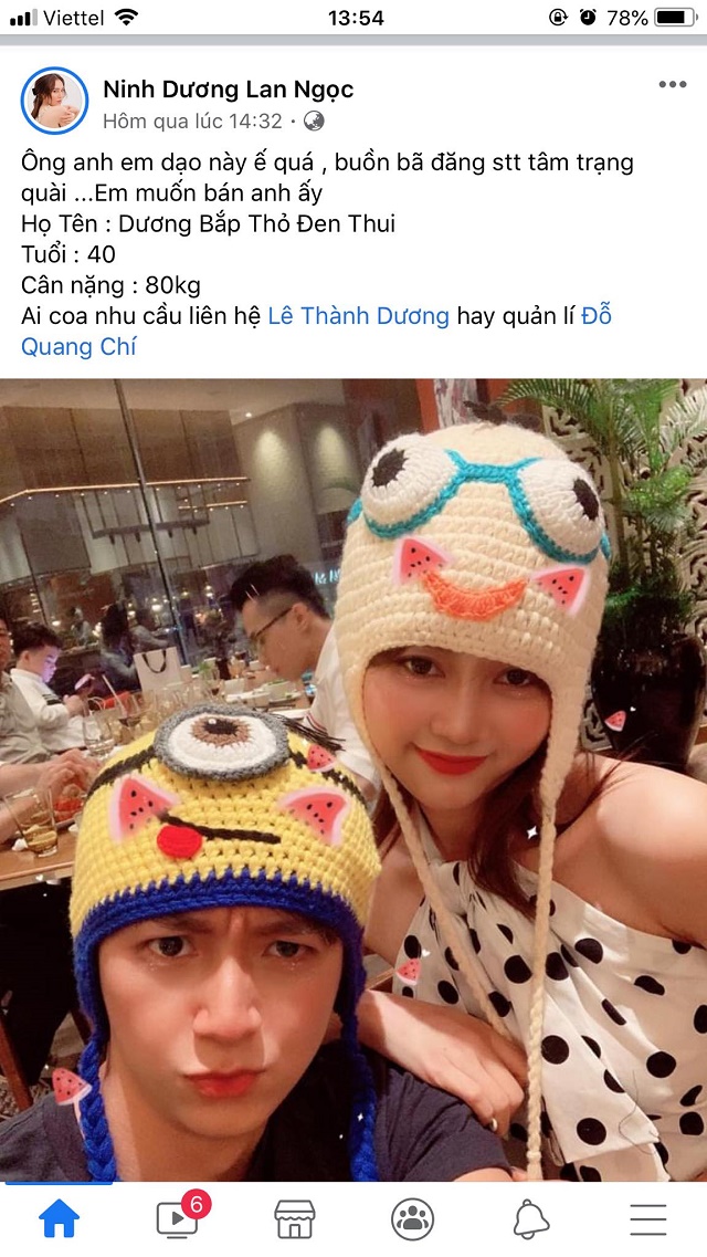 “Ông anh em dạo này ế quá , buồn bã đăng stt tâm trạng quài ...Em muốn bán anh ấy