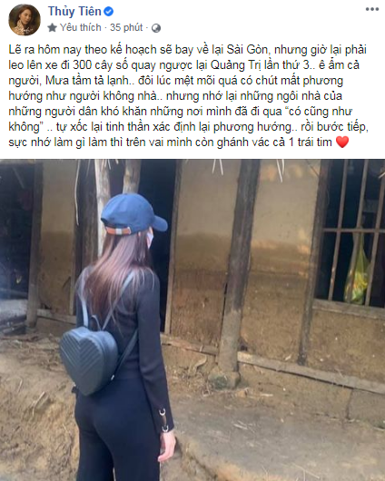 Cách đây vài phút , nữ ca sĩ còn cho biết đã quay trở lại Quảng Trị để cứu trợ người dân thứ 3. Bà xã Công Vinh cho biết theo kế hoạch sẽ bay vào Sài Gòn, nhưng khi nhớ lại những người dân vẫn đang vật lộn khó khăn, cô lại quyết tâm trở lại và cứu trợ hết sức mình.