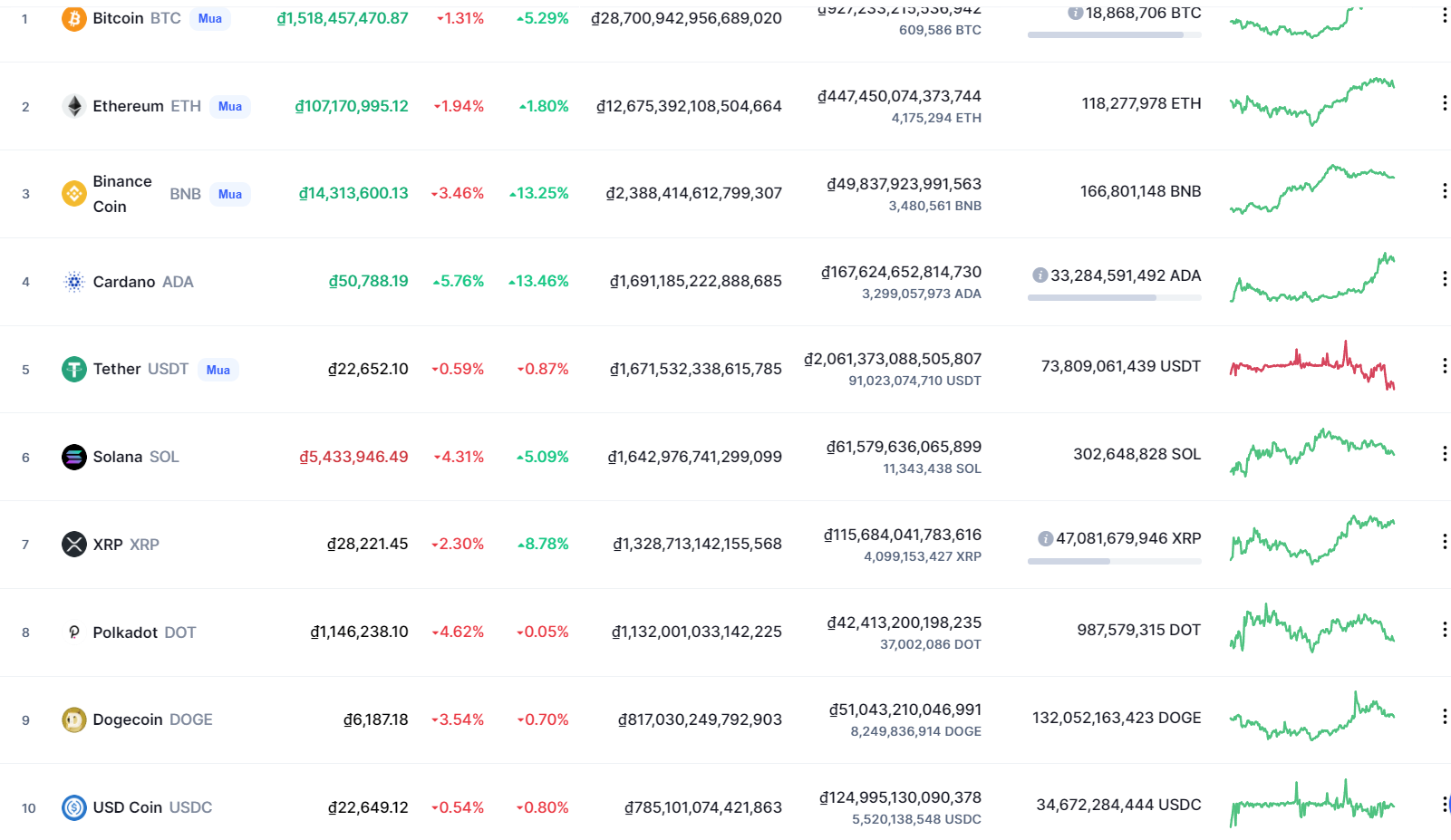 Giá tiền điện tử hôm nay theo vốn hóa thị trườngGiá Bitcoin hôm nay là 67150.04 USD với khối lượng giao dịch trong 24 giờ là 40971606725.06 USD. Bitcoin giảm 0,37 trong 24 giờ qua. Thứ hạng hiện tại trên CoinMarketCap là #1, với vốn hóa thị trường là 1267034324809.22 USD.