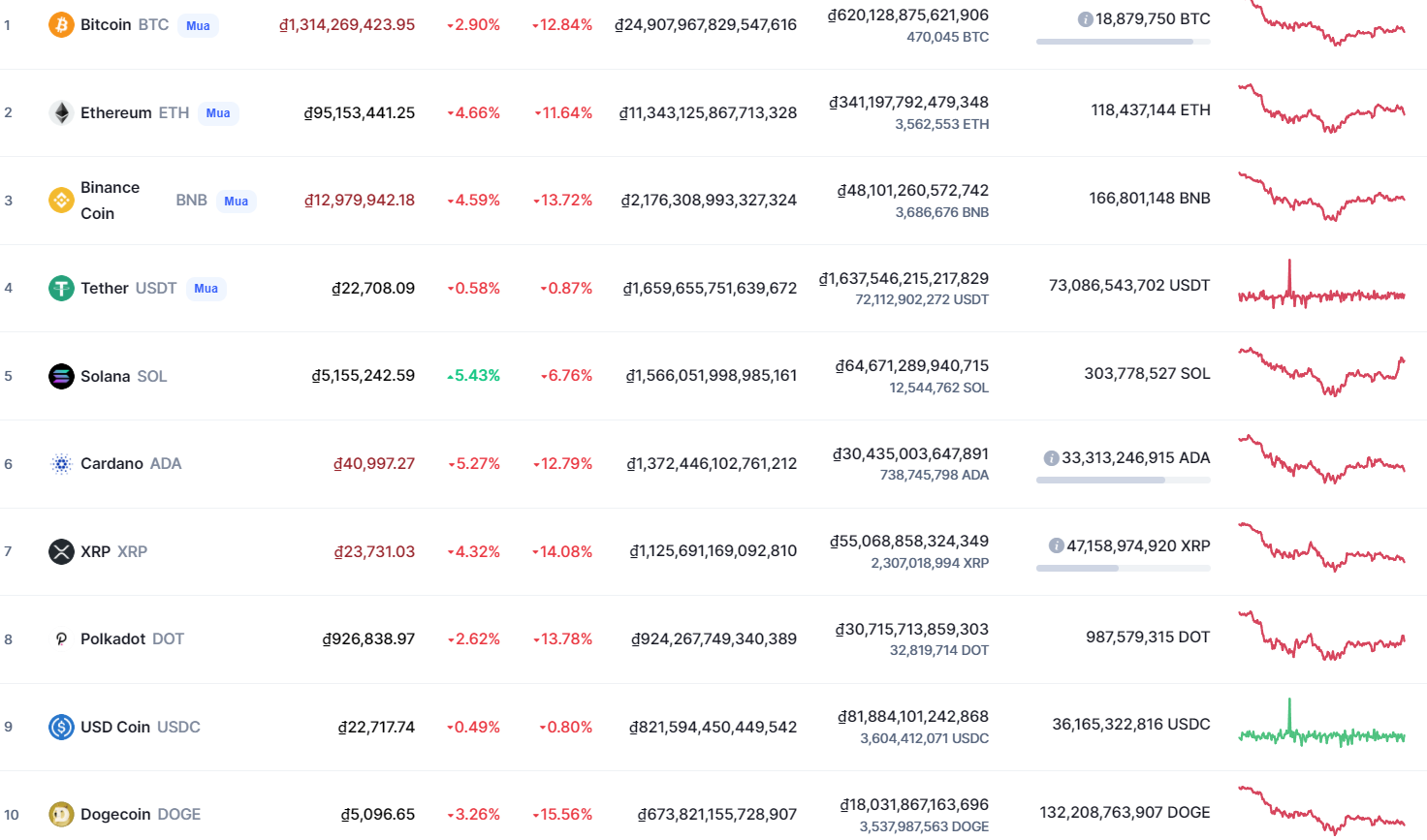 Giá tiền điện tử theo vốn hóa thị trườngTổng khối lượng giao dịch tiền điện tử trên thị trường trong 24 giờ qua là ₫2425.62T, tức tăng 2.68%. Tổng khối lượng giao dịch DeFi hiện tại là ₫360.43T, chiếm 14.86% tổng khối lượng giao dịch tiền điện tử trong 24 giờ. Khối lượng giao dịch của tất cả đồng tiền ổn định là ₫1899.10T, chiếm 78.29% tổng khối lượng giao dịch tiền điện tử trong 24 giờ.