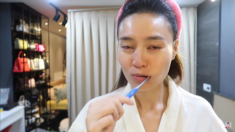 "Sáng sớm thức dậy, ai cũng phải đánh răng, nên tôi sẽ đánh răng cho mọi người xem. Đánh răng xong, tôi phải rửa mặt, đây là bước khá quan trọng. Tôi phải rửa mặt bằng máy rửa mặt chứ không dùng tay. Không biết mọi người có giống tôi không nhưng sáng dậy da tôi khá nhiều dầu nên tôi phải dưỡng da thật nhiều để make up thật ăn phấn.