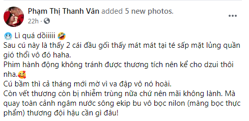 “Cú bầm thì cả tháng mới mờ vì va đập vô nó hoài. Còn vết thương còn bị nhiễm trùng nữa chứ nên mãi không lành. Mà quay toàn cảnh ngâm nước sông ekip bu vô bọc nilon (màng bọc thực phẩm) thương đội hậu cần gì đâu!” - Ốc Thanh Vân chia sẻ.
