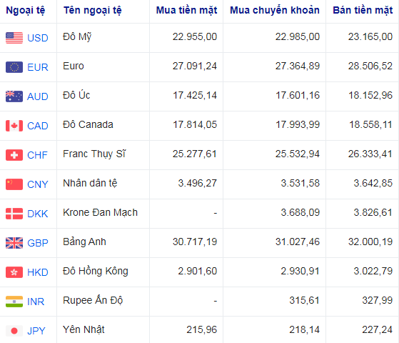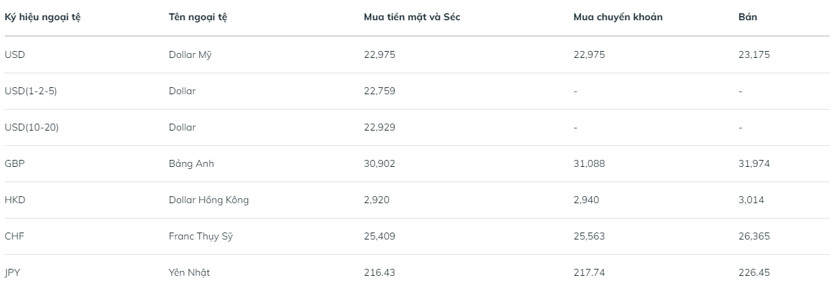 Vietcombank niêm yết tỷ giá ở mức: 22.955 và 23.165 đồng/USD, BIDV là 22.975 và 23.175 đồng/USD, Vietinbank 22 là 22.931 đồng/USD và 23.174 đồng/USD, Techcombank dao động ở mức 22.944 và 23.169 đồng/USD.