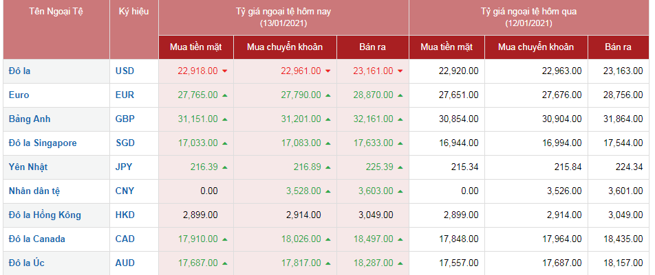 Tại thị trường Việt Nam, ngày 13/1 Ngân hàng Nhà nước (NHNN) niêm yết tỷ giá trung tâm ở mức 23.134 VND/USD, giảm 6 đồng so với ngày hôm qua. Tỷ giá tham khảo tại Sở giao dịch NHNN ở mức 23.125 VNĐ/USD (mua vào) - 23.778 VNĐ/USD (bán ra).