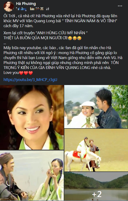 “Các fan đã gửi tin nhắn cho Hà Phương rất nhiều với lời ngỏ ý: mong Hà Phương cố gắng giúp lo chuyển thi hài bạn Long về Việt Nam giống như diễn viên Anh Vũ. Hà Phương thật sự không ngại giúp nhưng chúng mình phải nên tôn trọng ý kiến của gia đình Vân Quang Long nhé cả nhà“, Hà Phương bộc bạch.