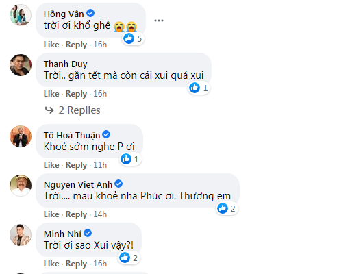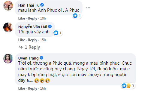 Dưới bài đăng, hàng loạt nghệ sĩ Việt vô cùng hốt hoảng khi biết tin nam nghệ sĩ bị tai nạn. Theo đó, Hồng Vân, Minh Nhí, Hàn Thái Tú đã rất đau xót và không quên gửi lời động viên đến Trọng Phúc mau chóng khỏe lại.