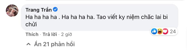 Đáng chú ý hơn cả, trong rất nhiều bình luận của cư dân mạng dưới bài đăng này là lời đáp trả gay gắt của Trang Trần – “vợ” Đàm Vĩnh Hưng với netizen. Mở đầu câu chuyện, cựu người mẫu bình luận: “Tao viết kỷ niệm chắc lại bị chửi”.