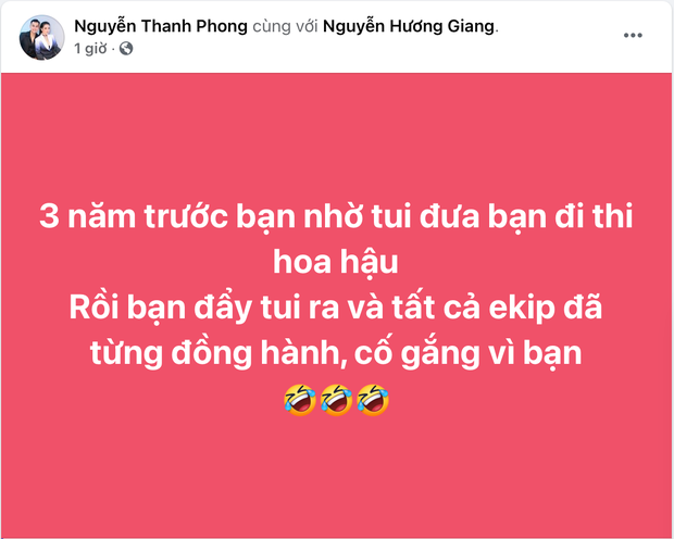 Trước đó, cựu quản lý của Hương Giang – Nguyễn Thanh Phong đã bất ngờ đăng status đấu tố nàng Hậu: “3 năm trước bạn nhờ tui đưa bạn đi thi Hoa hậu. Rồi bạn đẩy tui ra và tất cả ekip đã từng đồng hành, cố gắng vì bạn". Sau vài phút, anh tag thẳng Hương Giang vào dòng trạng thái, đồng thời tiết lộ thêm nhiều câu chuyện bên dưới phần bình luận.