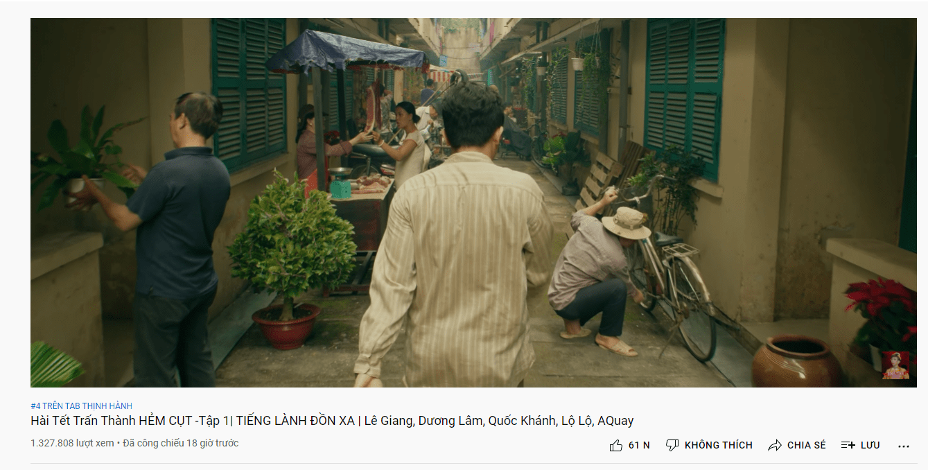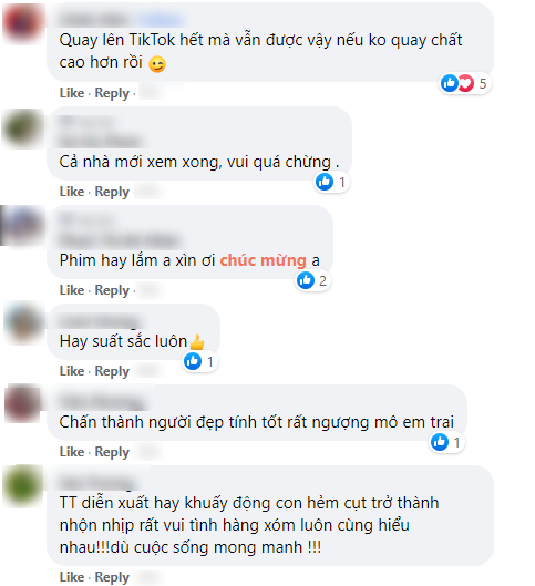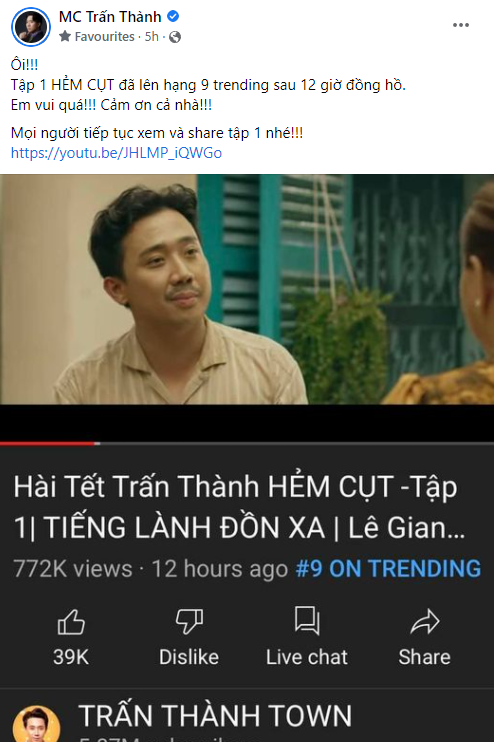 “Ôi!!! Tập 1 HẺM CỤT đã lên hạng 9 trending sau 12 giờ đồng hồ. Em vui quá!!! Cảm ơn cả nhà!!! Mọi người tiếp tục xem và share tập 1 nhé!!!”, Trấn Thành phấn khích nói.