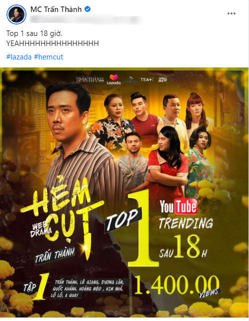 Mới đây nhất, Trấn Thành đã đăng tải trên trang cá nhân thông báo “tin vui” lớn về “con cưng” của mình đến người hâm mộ. Qua đó, bộ phim hài “Hẻm Cụt” do Trấn Thành sản xuất và thủ vai chính đã đạt được top 1 trending YouTube chỉ sau 18 giờ đồng hồ.
