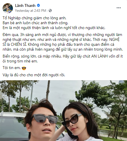 Tiếp đến, Lãnh Thanh nhắn thêm cho Nam Em rằng: "Đêm qua, 3 giờ sáng anh mới ngủ được, vì thương cho những người làm nghệ thuật như em, như anh và những nghệ sĩ khác. Thời nay, nghệ sĩ là chiến sĩ. Không những họ phải đấu tranh cho quan điểm cá nhân, mà còn phải hiên ngang để giữ lấy sự an nhiên trong lòng mình. Biển rộng sóng lớn, cá mập nhiều. Hãy giữ chút an lành vốn dĩ đã ít ỏi trong tim nhé em. Tôi tin em. Vậy là đủ cho một đời người rồi".