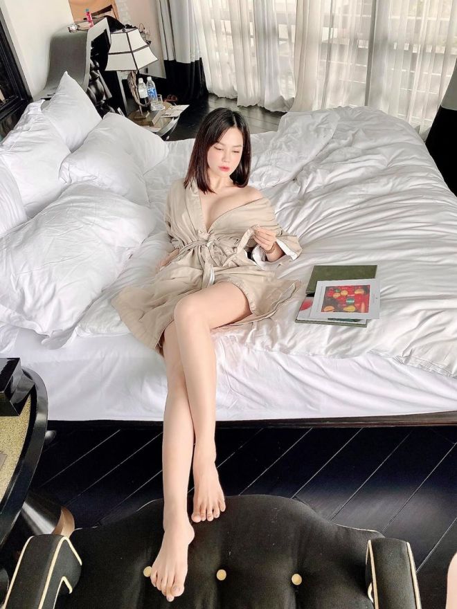 Cụ thể trong ảnh, người đẹp quê Bắc Ninh xuất hiện gợi cảm trên giường, hờ hững khoe vòng 1 và đôi chân dài miên man. CĐM khen ngợi hết lời nhan sắc Đào Lan Phương, cho rằng cô không kém cạnh Ngọc Trinh là bao.