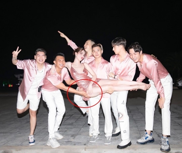Đây không phải là lần đầu tiên Ngọc Trinh có những hành động chạm tay vào cơ thể của mình và bạn khác giới. Cô từng để nhóm bạn nam bế mình trong khi chỉ mặc chiếc váy mỏng manh, để NTK Đỗ Long đặt tay vào vòng 3 hay thoải mái cho ekip thoa kem dưỡng lên cơ thể mình,...
