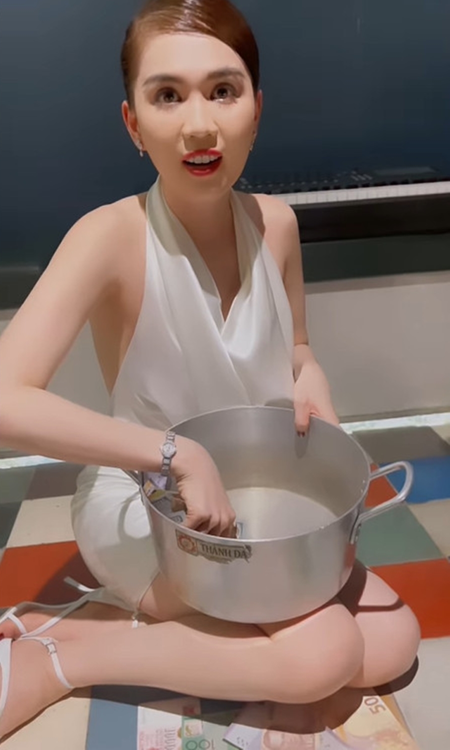 Trong đó, Ngọc Trinh cùng trợ lý Thúy Kiều và những người bạn đang chơi trò bịt mắt "hốt tiền" vào một chiếc nồi. Hình ảnh số lượng lớn những tờ ngoại tệ trong trò chơi của Ngọc Trinh khiến người thì trầm trồ, người lại ngao ngán: "Đúng là người giàu chơi game phải khác".