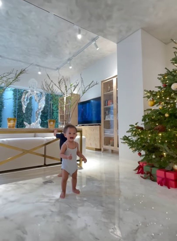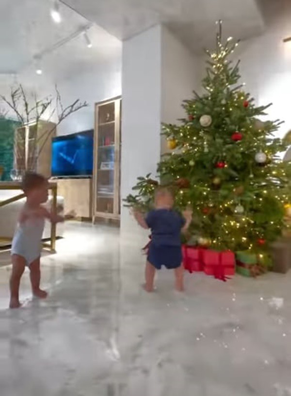 Cụ thể, nữ ca sĩ đang ghi lại khoảnh khắc 2 con đang vô cùng háo hức khi lần đầu nhìn thấy cây thông Noel được trang trí đầy sắc màu trong nhà. Sau khi vây quanh cây thông, Lisa vô cùng hào hứng nhún nhảy theo nhạc. Nhưng Leon lại có âm thầm có hành động khiến ai cũng phải bất ngờ.