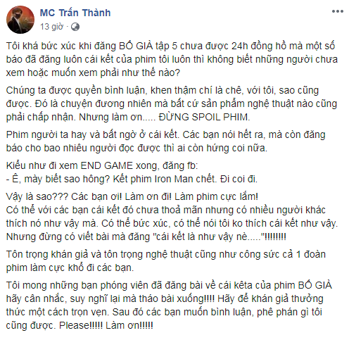Anh bày tỏ: "Tôi khá bức xúc khi chiếu "Bố già" tập 5 chưa được 24h đồng hồ mà một số đã đăng luôn cái kết của phim tôi luôn thì không biết những người chưa xem hoặc muốn xem phải như thế nào?"