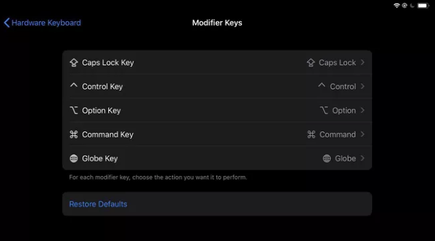 Trên iPad, từ iOS 13.4, người dùng có thể tuỳ chọn để gán tính năng khác cho các phím như Caps Lock, Control, Option, Command và Globe.