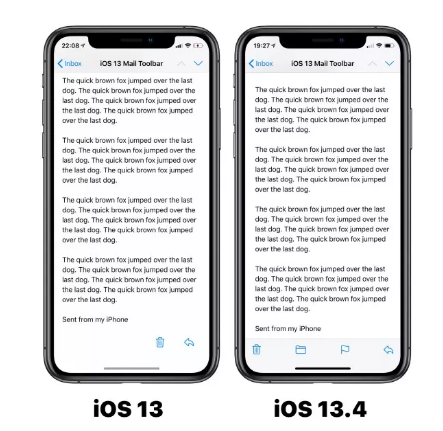 Khi iOS 13 ra mắt, , Apple đã chỉnh sửa thanh công cụ của ứng dụng Mail, để nút Reply (Phản hồi) và Delete (Xoá) quá sát nhau, khiến người dùng thường hay ấn nhầm. Ở phiên bản mới này, Apple đã sửa lỗi với 1 thanh công cụ hoàn toàn mới, tách 2 nút bấm trên ra.