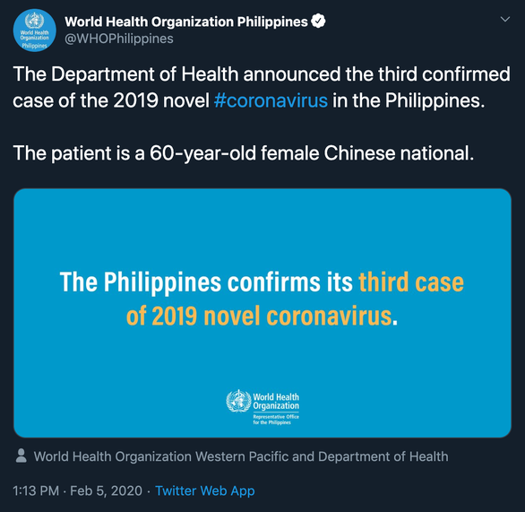 Theo Guardian, Philippines xác nhận trường hợp nhiễm bệnh thứ 3. WHO cho biết bệnh nhân là một phụ nữ Trung Quốc 60 tuổi.