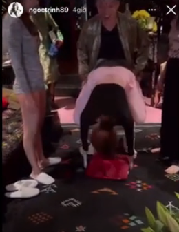 Trong clip, dưới sự cổ vũ của bạn bè, Ngọc Trinh đã có màn lộn người bật lên ghế, hoàn thành thử thách đầy oái oăm chỉ trong 13 giây. Trong trang phục ôm sát, Ngọc Trinh đã khoe trọn được đường cong cơ thể, đặc biệt là vòng 3 nóng bỏng.