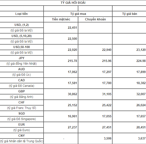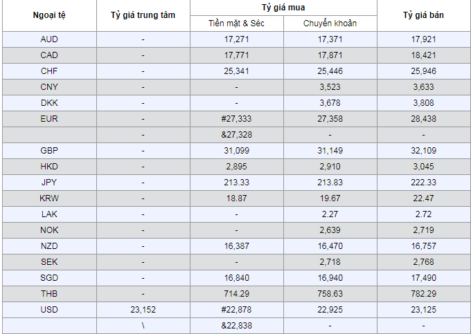 Các ngân hàng thương mại giữ tỷ giá ngoại tệ đồng USD phổ biến ở mức 22.878 đồng (mua) và 23.125 đồng (bán). Vietcombank niêm yết tỷ giá ở mức: 22.190 và 23.120 đồng/USD. BIDV là 22.925 và 23.125 đồng/USD. Vietinbank là 22.878 và 23.125 đồng/USD. Techcombank là 22.920 và 23.120 đồng/USD.