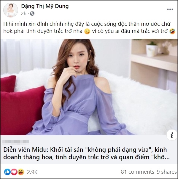 Mới đây nhất, đích thân nữ diễn viên đã lên tiếng khi chia sẻ về đường tình duyên hiện tại của mình. Mỹ nhân đình đám viết: “Mình xin đính chính nhẹ đây là cuộc sống độc thân mơ ước chứ không phải tình duyên trắc trở nha, vì có yêu ai đâu mà trắc với trở".