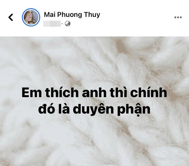 Cách đây không lâu, Mai Phương Thúy bất ngờ đăng tải trên trang cá nhân dòng trạng thái gây chú ý. Cụ thể, nàng Hậu công khai tỏ tình với một người đàn ông bằng caption đầy lãng mạn: “Em thích anh thì chính đó là duyên phận”.