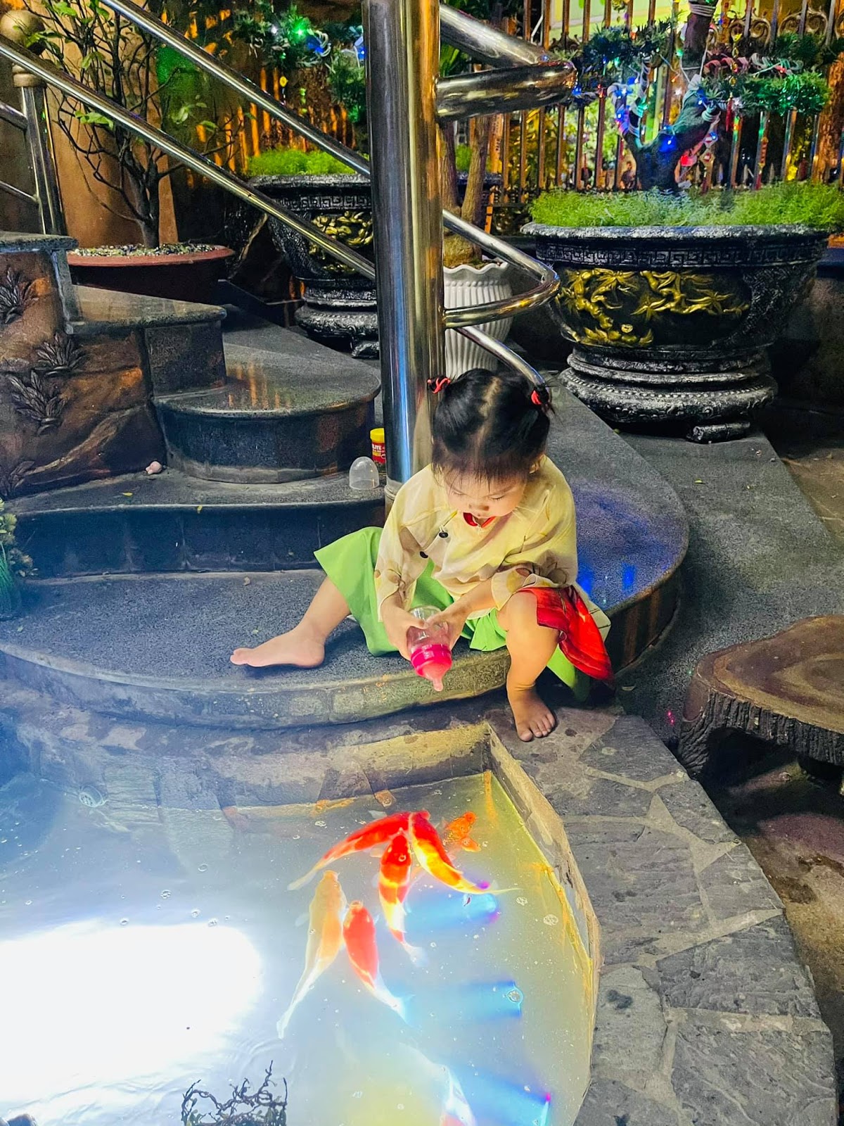 Cụ thể, Con gái Thanh Thảo – Bé Talia thích thú và hào hứng với hồ cá coi lớn trong tư gia của Ngọc Sơn. Cô bé còn được trực tiếp cho những chú cá coi này bú bình. Nhìn nét mặt chăm chú, tập trung toát lên sự thích thú từ Talia.
