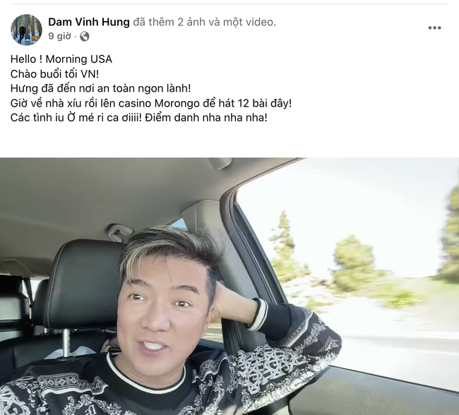 Mới đây, Đàm Vĩnh Hưng dã đăng tải hình ảnh đi lưu diễn, xác nhận thông tin đã đến Mỹ. Nam ca sĩ hào hứng chia sẻ: “Hello. Morning USA. Chào buổi tối Việt Nam. Hưng đã đến nơi an toàn ngon lành. Giờ về nhà xíu rồi lên Casino Morongo để hát 2 bài đây. Các tình yêu ở America ơi. Điểm danh nha".