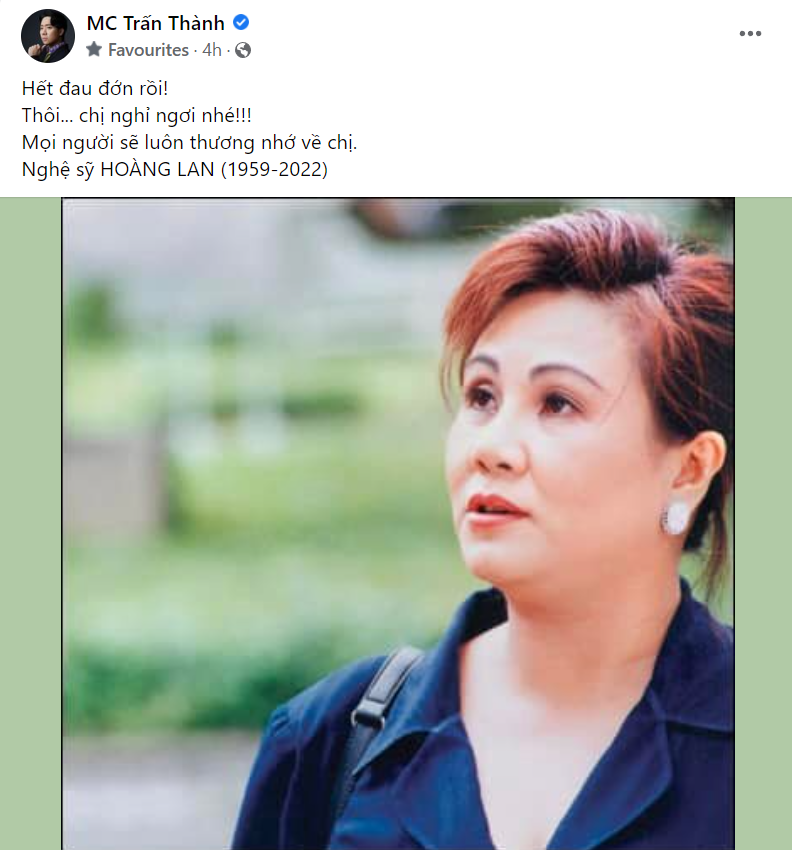 MC Trấn Thành đau đớn viết: “Hết đau đớn rồi! Thôi... chị nghỉ ngơi nhé!!! Mọi người sẽ luôn thương nhớ về chị. Nghệ sỹ HOÀNG LAN (1959-2022)”