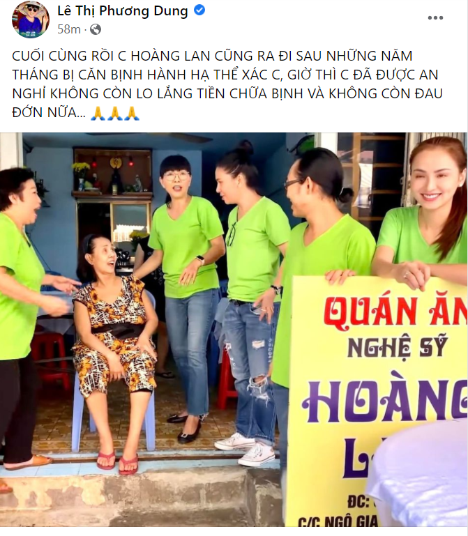 "Bệnh tình trở nặng, cộng thêm chi phí điều trị cạn kiệt, chị Hoàng Lan rơi vào cảnh bế tắc. Hôm nay chị ấy đã ra đi, xem như giải thoát sự đau đớn đối với chị" – chị Lê Thị Thắm (người chăm sóc cho NS Hoàng Lan) xúc động nói.
