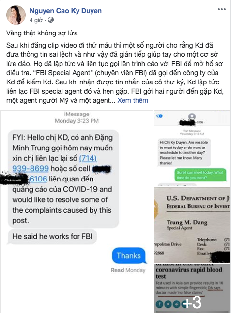 Sau khi nhận thông báo, Kỳ Duyên đã ngay lập tức chấp hành và gặp mặt FBI. “FBI gửi hai người đến gặp tôi: một đặc vụ người Mỹ và một đặc vụ người Mỹ gốc Việt. Họ hỏi tôi rất kỹ về các chi tiết: Cô có làm việc cho M.Đ (bác sĩ xét nghiệm cho nữ MC) không (không), loại test kit cô thử là loại gì (igG/igM Rapid Test from Korea), cô thử làm sao, M.Đ đã nói gì với cô, đã gửi gì cho cô… Sau khi nói chuyện với tôi, họ nói sẽ tiếp tục điều tra bác sĩ M.Đ.” - Nữ MC nói.