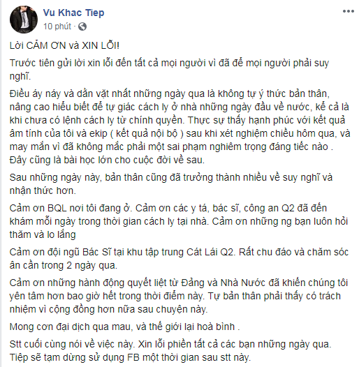 Thời gian gần đây, sự việc Vũ Khắc Tiệp than vãn khi phải cách ly gây bức xúc trong CĐM. Làn sóng chỉ trích ông bầu này dữ dội đến nỗi anh phải viết “tâm thư” xin lỗi vì những hành động của mình. Anh cho biết bản thân cảm thấy vô cùng áy náy và dằn vặt đồng thời thông báo sẽ tạm ngừng dùng mạng xã hội Facebook.