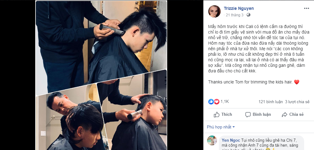 Không những thế, vợ cũ Bằng Kiều còn phải chuyển sang bán trà sữa để mưu sinh.Thậm chí, cô phải đi tự tay ship trà sữa của cửa hàng để cầm cự qua mùa dịch và tiết kiệm chi tiêu. Bên cạnh đó, thống đốc bang California còn yêu cầu người dân không được ra khỏi nhà từ ngày 19/3, nữ ca sĩ U55 lại phải tất bật mua tích trữ giấy vệ sinh và đồ ăn cho các con để dự trữ. Thậm chí, bạn trai mới của Trizzie Phương Trinh còn phải tự tay cắt tóc cho các con.