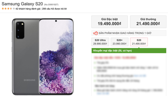 Hiện tại, trên trang web của một số hệ thống lớn, tất cả các mẫu Galaxy S20, S20+ và S20 Ultra đều được giảm giá 2 triệu đồng so với mức gia bán đầu. Giá bán của các máy lần lượt là 19,5 triệu, 22 triệu và 28 triệu (Giá gốc: 21,49 triệu, 23,99 triệu đồng và 29,99 triệu đồng).