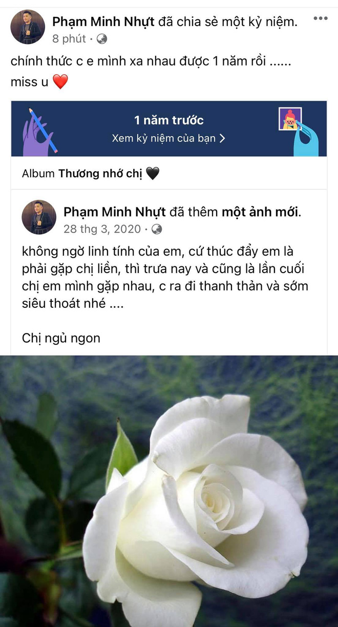 “Cách đây 1 năm, đến giờ này là trong lòng khó tả lắm. Trưa nắng nóng nhưng lòng vẫn không thể ở nhà, thế là chạy gần 1 giờ đồng hồ đến với chị. Vừa mở cửa ra, chị gần như kiệt sức lắm rồi, nhưng vẫn cố gắng mở mắt nhìn em. Tấm hình hôm đó về chị, em vẫn còn cất giữ, mỗi lần xem lại tấm hình đó, nước mắt em lại rơi và đau lắm khi thấy chị đau đớn về thân thể quá. Giờ chị nhẹ nhàng rồi, vui vẻ ở thế giới bên kia nhé chị yêu , em cố gắng sống tốt ạ. Mãi thương và nhớ về chị”, Quản lý cũ Mai Phương nghẹn ngào nói.