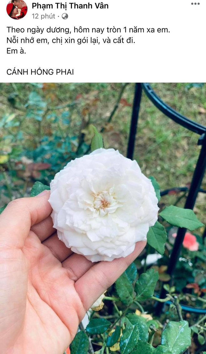 Trên trang cá nhân của Ốc Thanh Vân, cô đăng tải hình ảnh 1 bông hồng trắng tưởng nhớ NS Mai Phương. Lúc sinh thời, nữ nghệ sĩ là người bạn vô cùng thân thiết, gắn bó như chị em. Không nén được đau thương, bà xã Trí Rùa nghẹn ngào bày tỏ: “Theo ngày dương, hôm nay tròn 1 năm xa em. Nỗi nhớ em, chị xin gói lại, và cất đi. Em à, cánh hồng phai”.