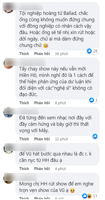 Bên dưới phần bình luận, nhiều người kêu gọi "kéo" lên Đà Lạt để xem Hiền Hồ biểu diễn nhưng cũng có loạt ý kiến khuyên nữ ca sĩ nên rút khỏi show để thưởng thức trọn vẹn giọng hát của Vũ.