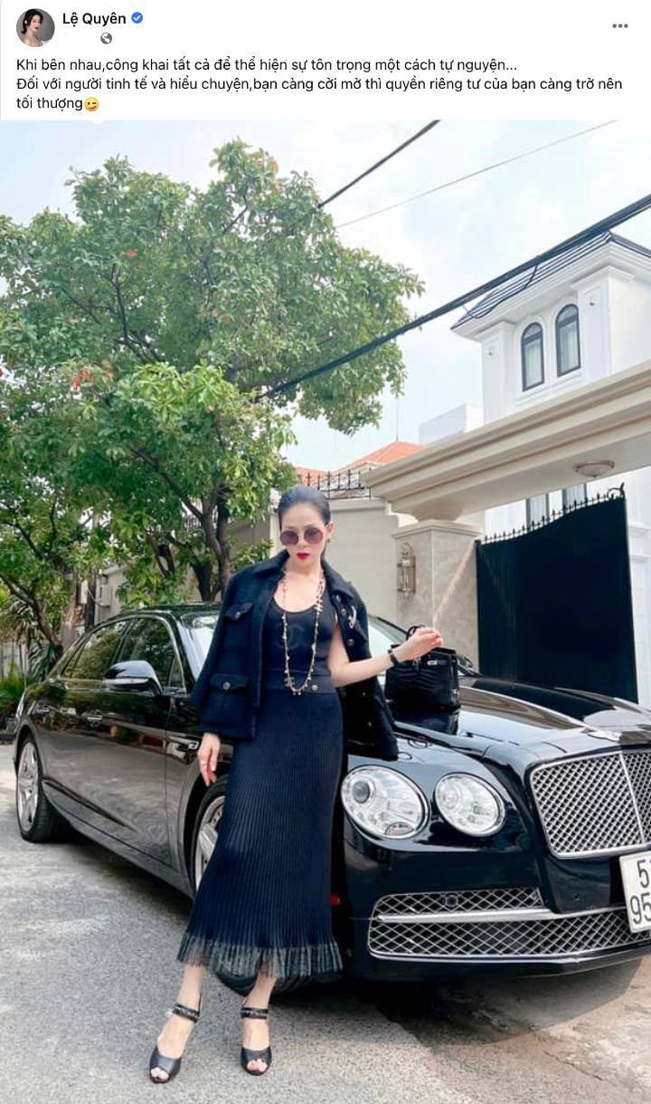 Từ trang phục cho đến chiếc siêu xe và căn biệt thự phía sau, dân tình phải trầm trồ với bức ảnh sang chảnh, ngập mùi tiền của Lệ Quyên. Bên dưới bài viết, cư dân mạng đã dành rất nhiều lời khen cho nhan sắc cũng như quan điểm của cô về tình yêu.