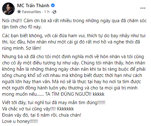 Cách đây ít phút, Trấn Thành bất ngờ đăng tải dòng trạng thái dài nhắc đến Hari Won khiến dân tình không khỏi chú ý. Cụ thể, nam MC xúc động gửi lời cảm ơn bà xã suốt những ngày qua đã chăm sóc tận tình khi anh mắc Covid-19: “Cảm ơn bà xã rất nhiều trong những ngày qua đã chăm sóc tận tình cho f0 này”.