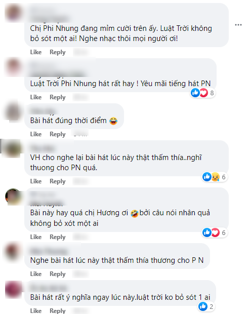 Ngay lập tức, dưới phần bình luận, nhiều cư dân mạng đã đồng loạt gọi tên bà Nguyễn Phương Hằng. Ai cũng cảm thấy hả hê khi nữ CEO Đại Nam bị tạm giam. Người hâm mộ còn bày tỏ nỗi nhớ Phi Nhung và bài hát “Luật trời” mang ý nghĩa vô cùng thấm thía.