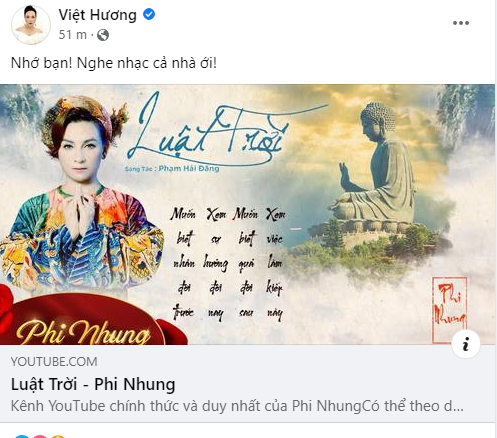 Cụ thể, Việt Hương bất ngờ nhắc đến Phi Nhung và share MV ca nhạc “Luật trời” của người bạn thân. Cô đăng tải dòng trạng thái đầy ẩn ý: “Nhớ bạn! Nghe nhạc cả nhà ới!”.